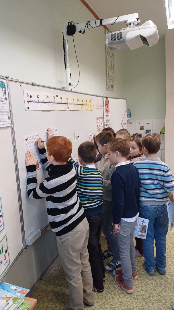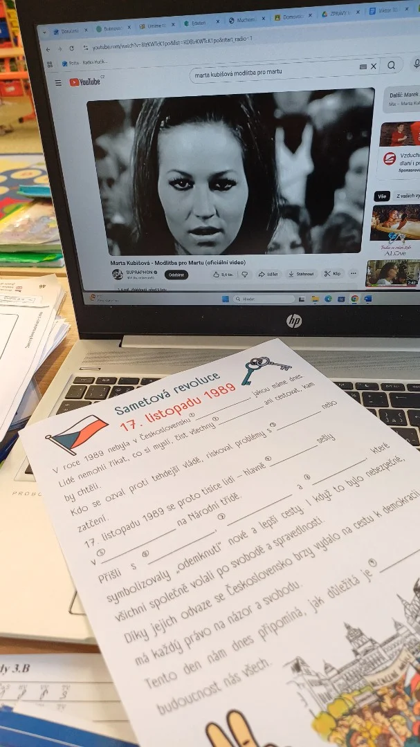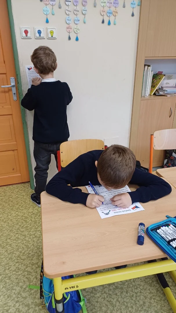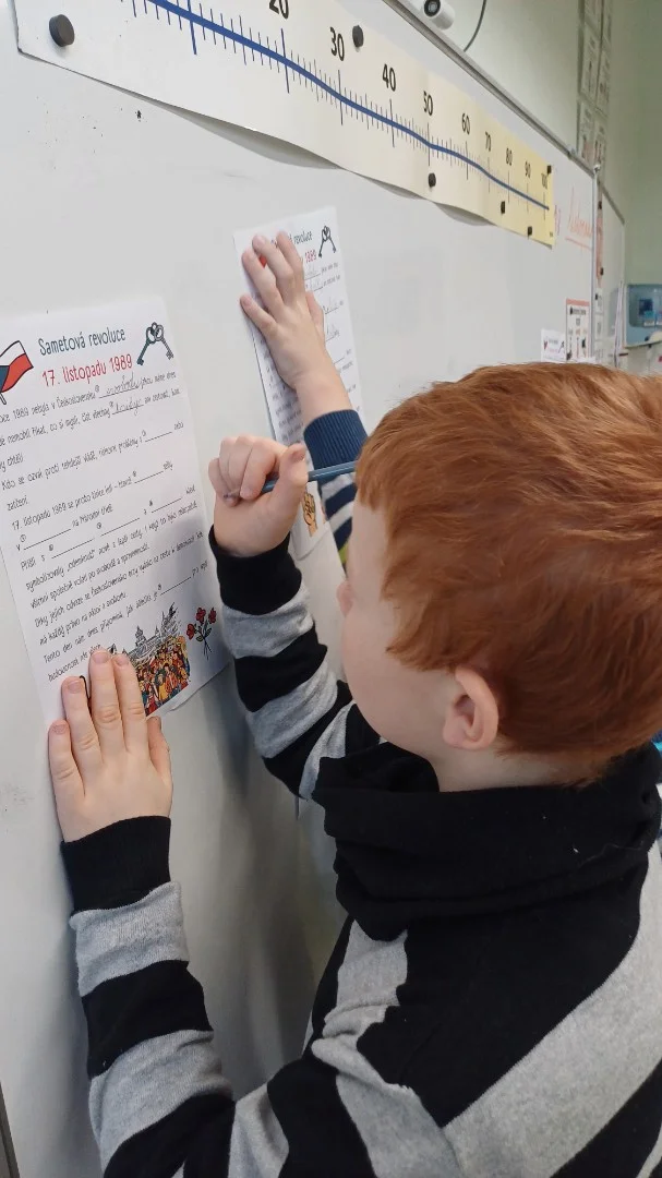 17. listopad si děti připomněly společným čtením textu, o symbolech 17. listopadu pak debatovaly nad obrázky.