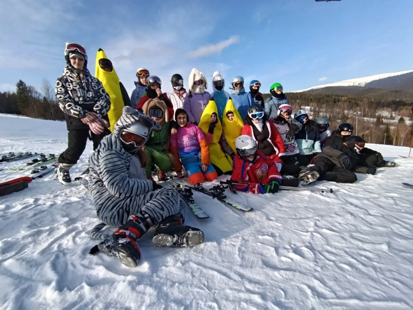 Ve čtvrtek byl shon největší, protože nás čekal karneval na lyžích. Každý z nás si měl přivézt kostým a lyžovat v něm. Učitelům se nejvíc líbila jahoda, ale i převlek banánu měl úspěch. Na svahu na nás pořvávali: „Čau banáne, pěkný kostým.“