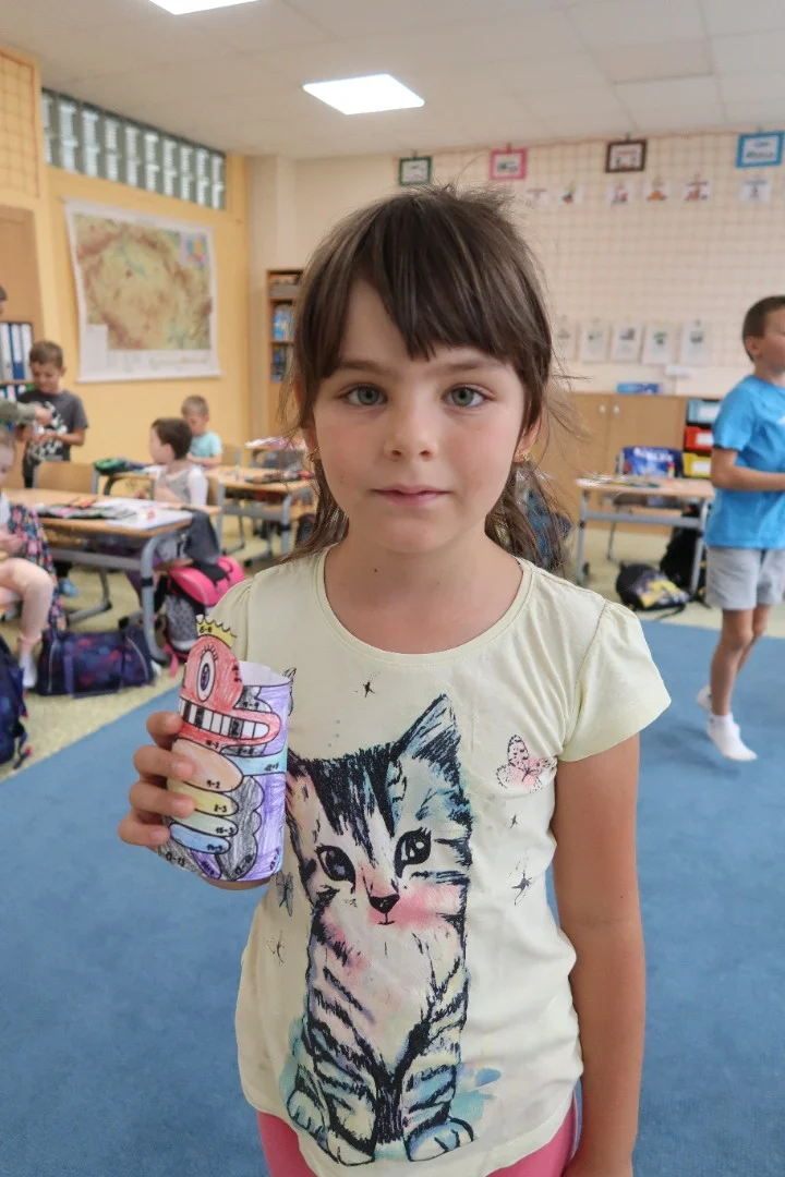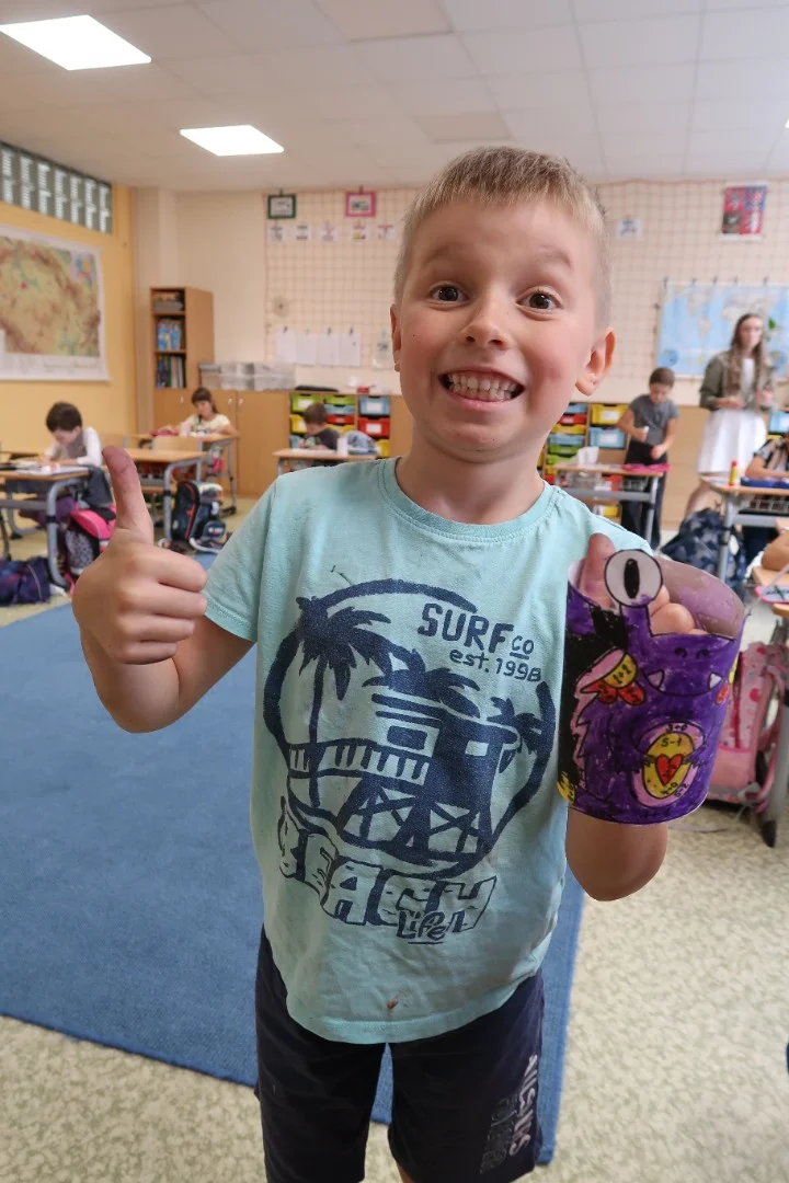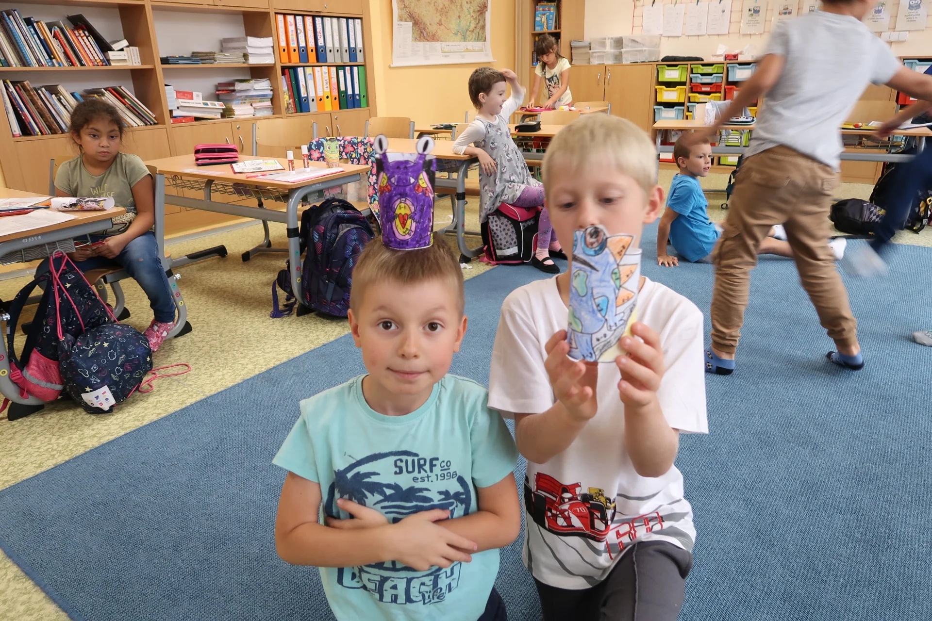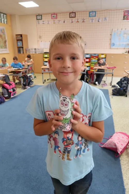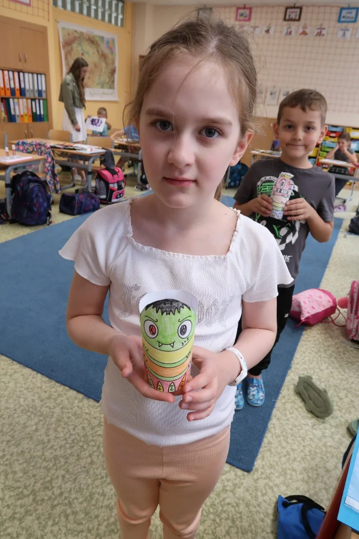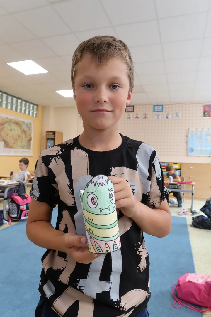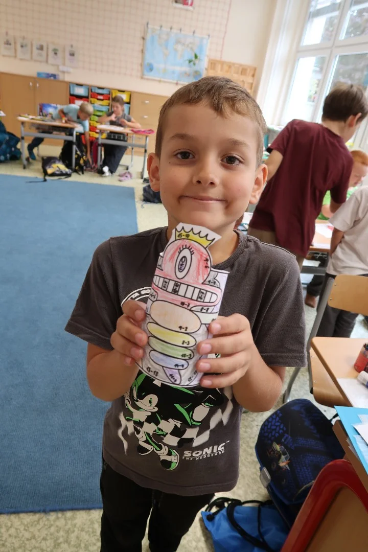 Nejdříve jsme počítali příklady, pak vybarvili, vystřihli a slepili příšerku. Moc nám to s nimi slušelo!!!