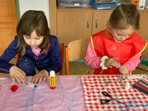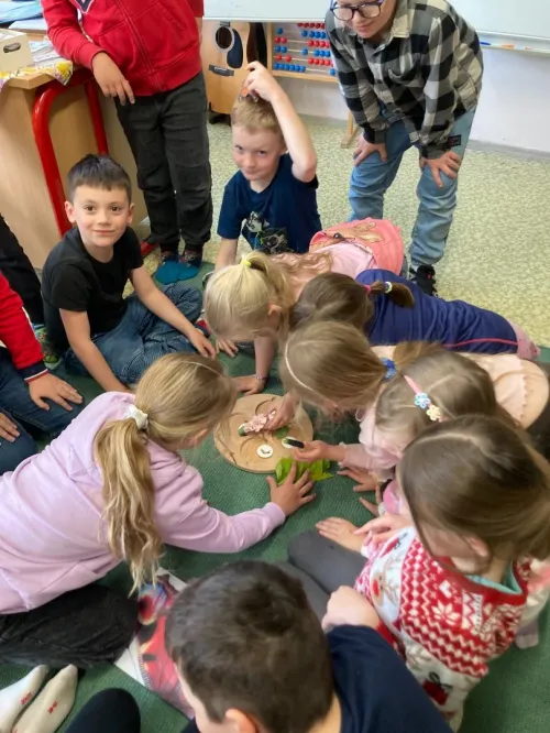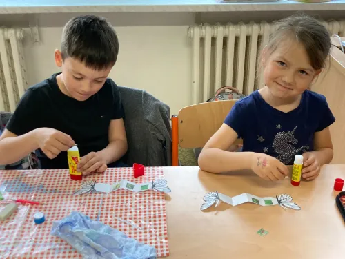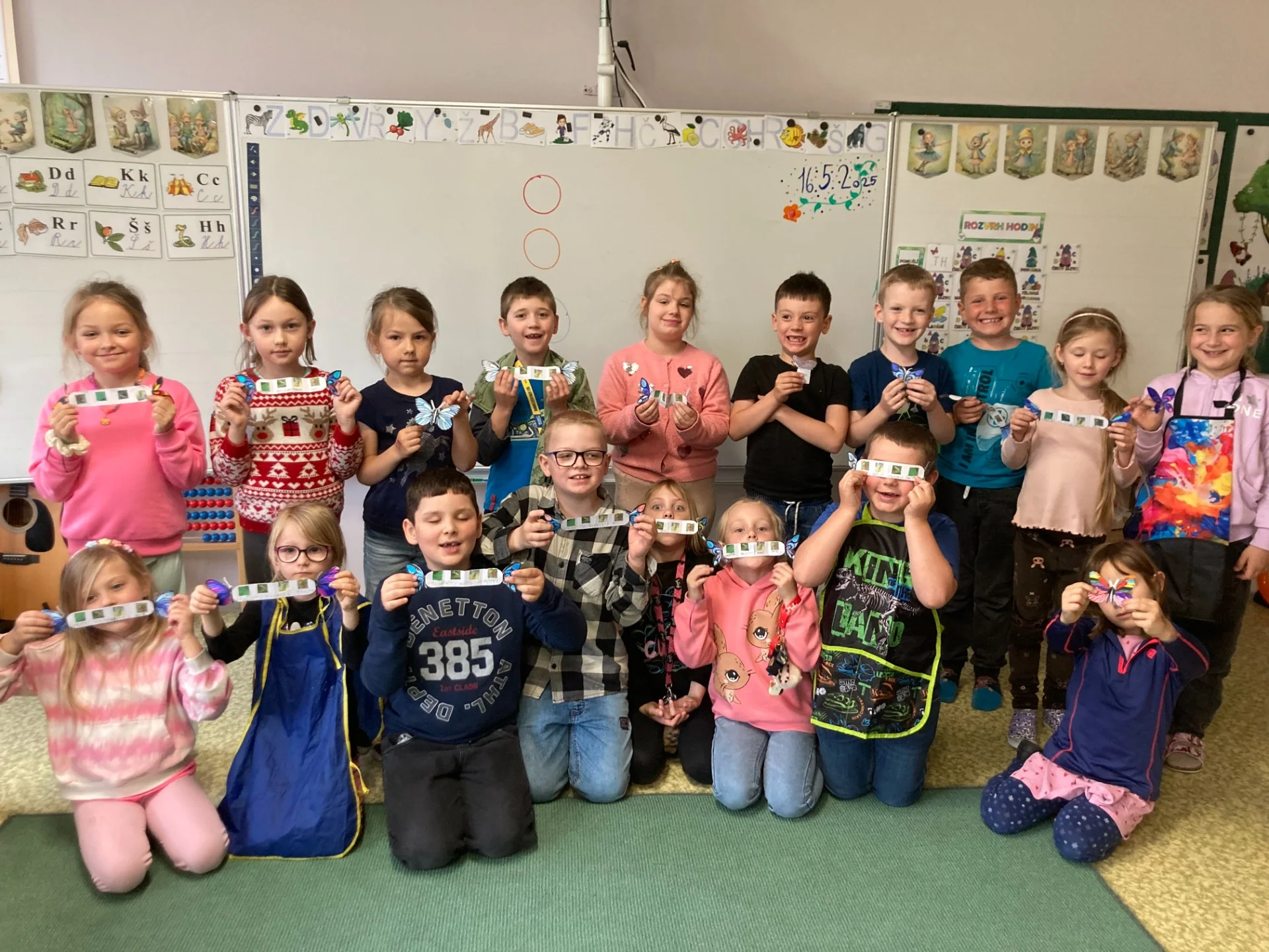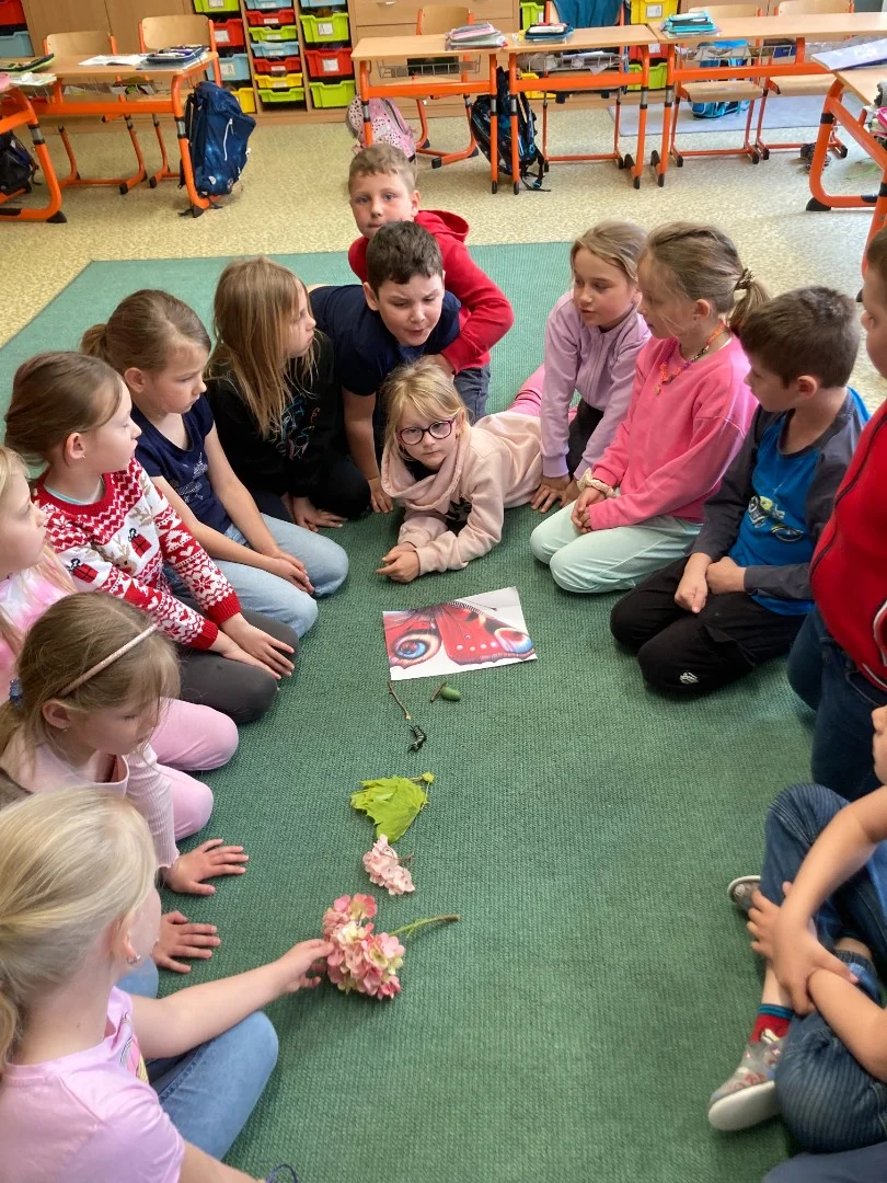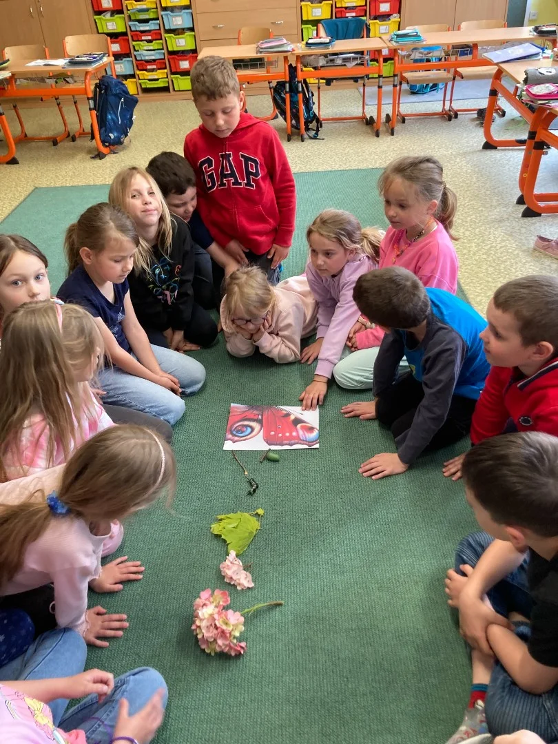 V projektové hodině se děti dozvěděly zajímavosti z motýlího života. Aktivity jsme spojili s výtvarkou, kde si každý motýlka vybarvil a nalepil jeho vývojová stádia. Další obrázek motýla jsme vybarvovali podle osové souměrnosti. No a to nejzajímavější - pozorovali jsme živé housenky, jak se mění v kuklu a z ní vyletí opravdový živý motýl.