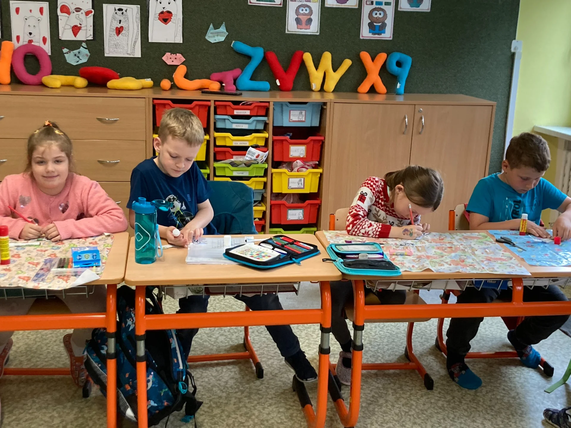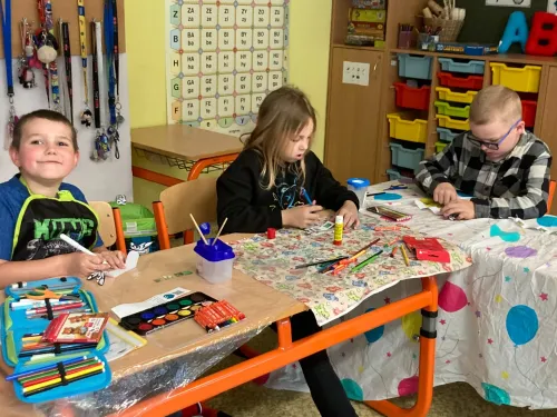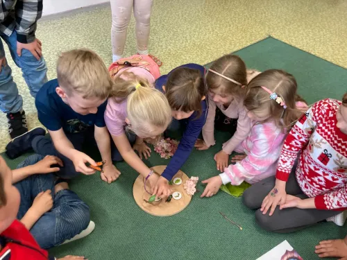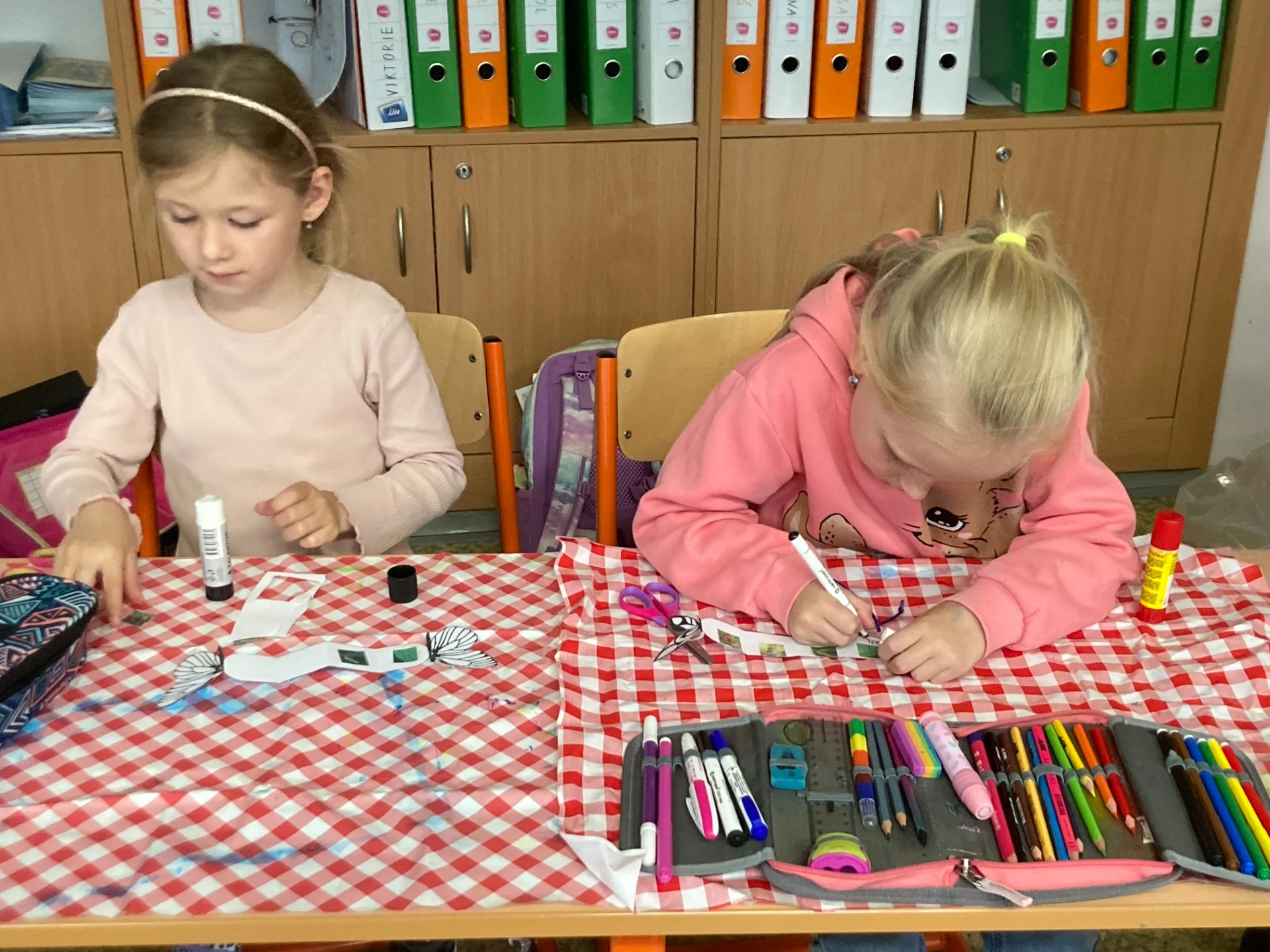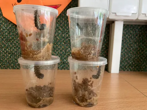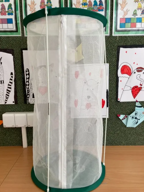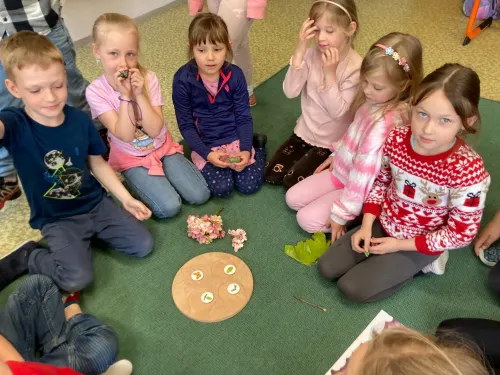 V projektové hodině se děti dozvěděly zajímavosti z motýlího života. Aktivity jsme spojili s výtvarkou, kde si každý motýlka vybarvil a nalepil jeho vývojová stádia. Další obrázek motýla jsme vybarvovali podle osové souměrnosti. No a to nejzajímavější - pozorovali jsme živé housenky, jak se mění v kuklu a z ní vyletí opravdový živý motýl.