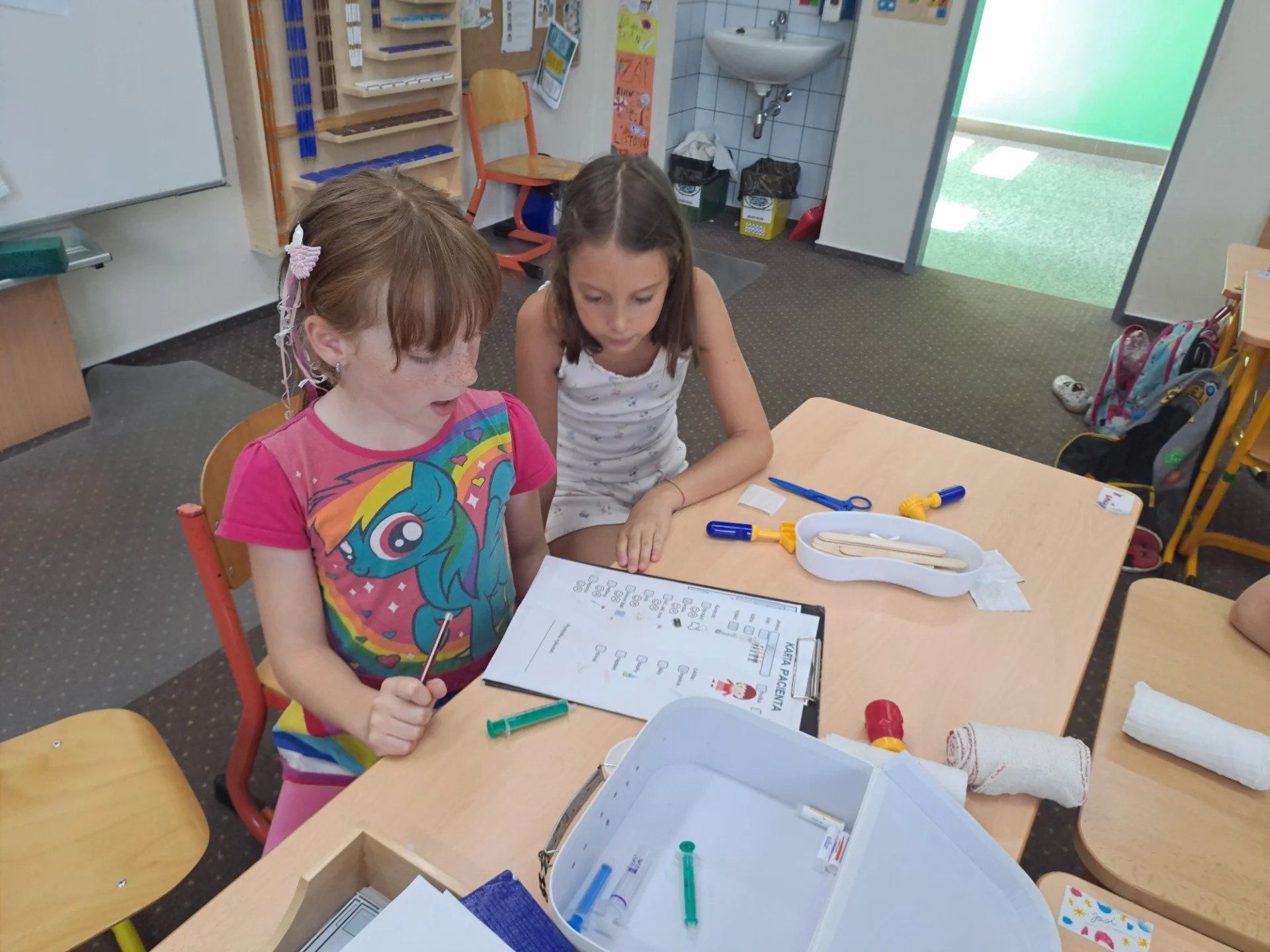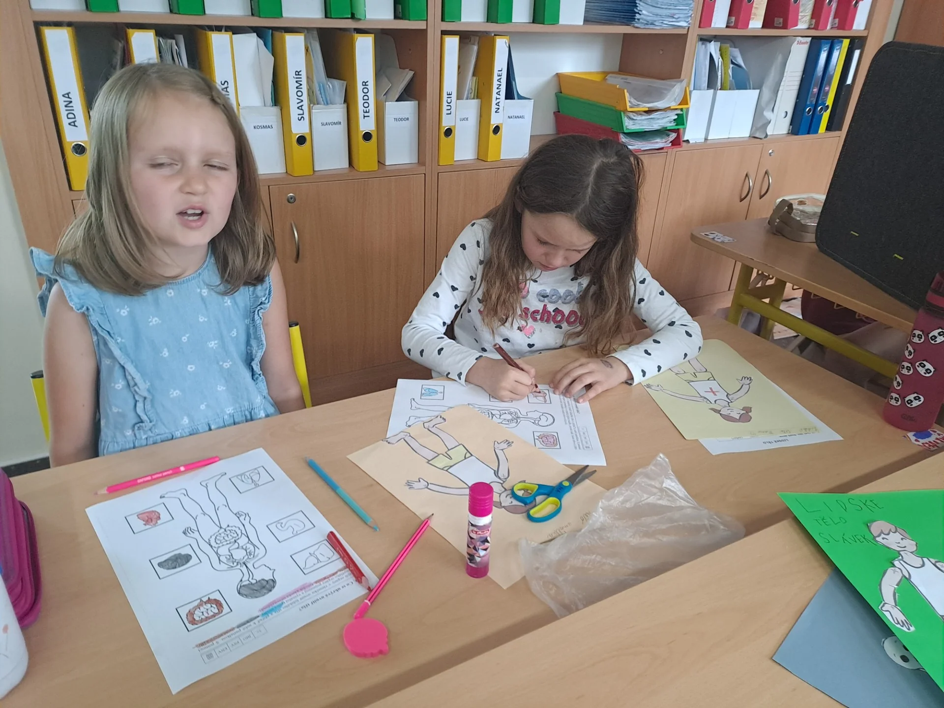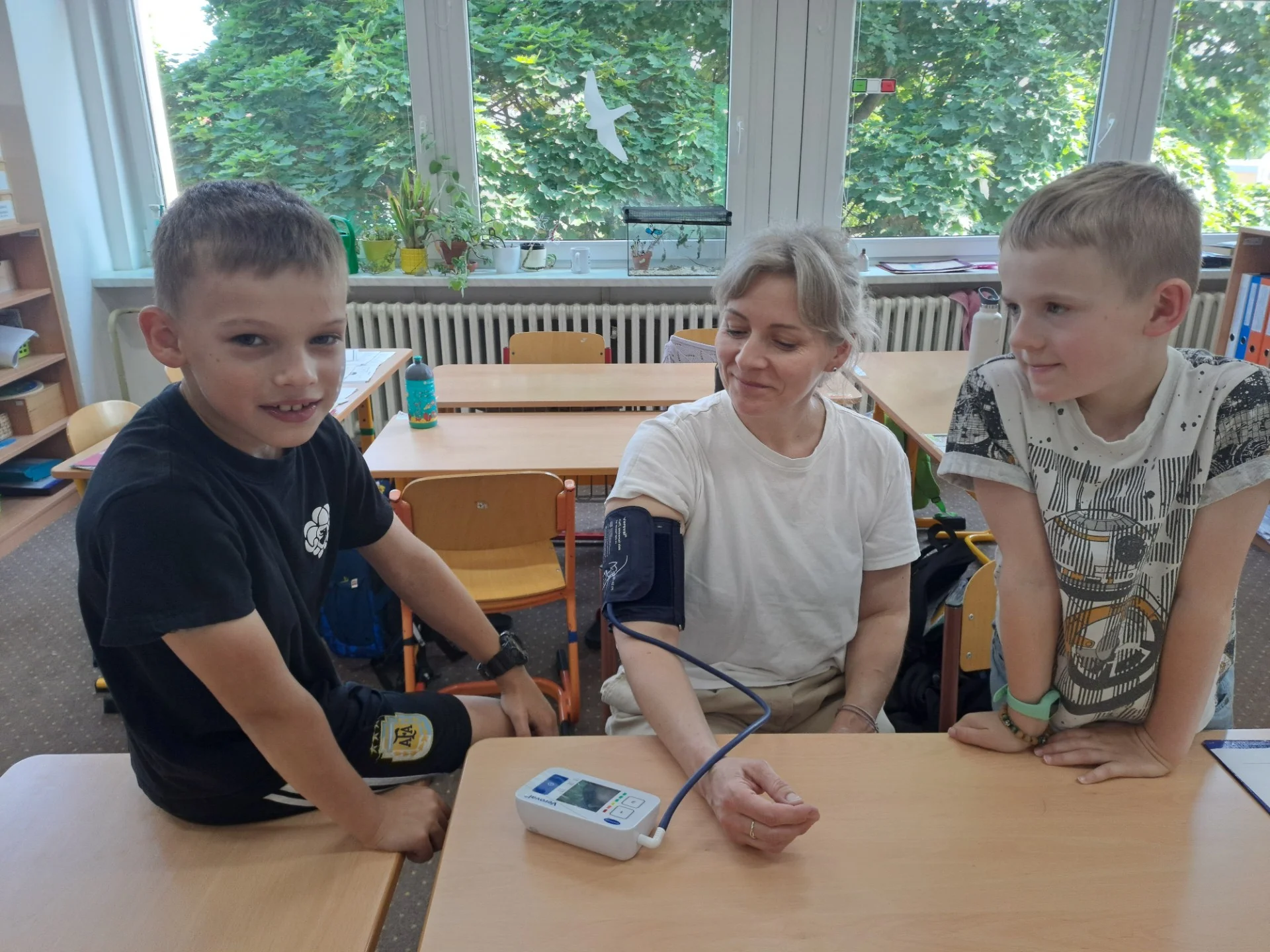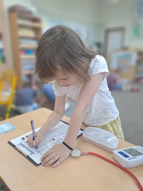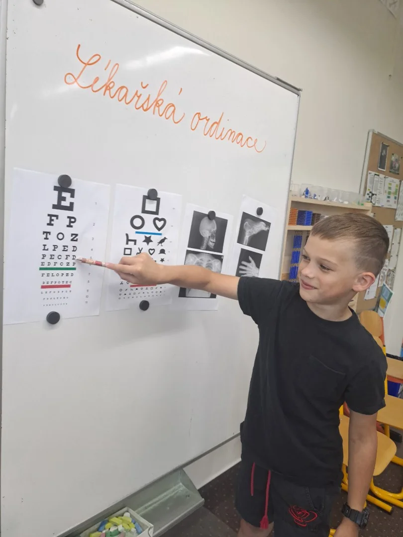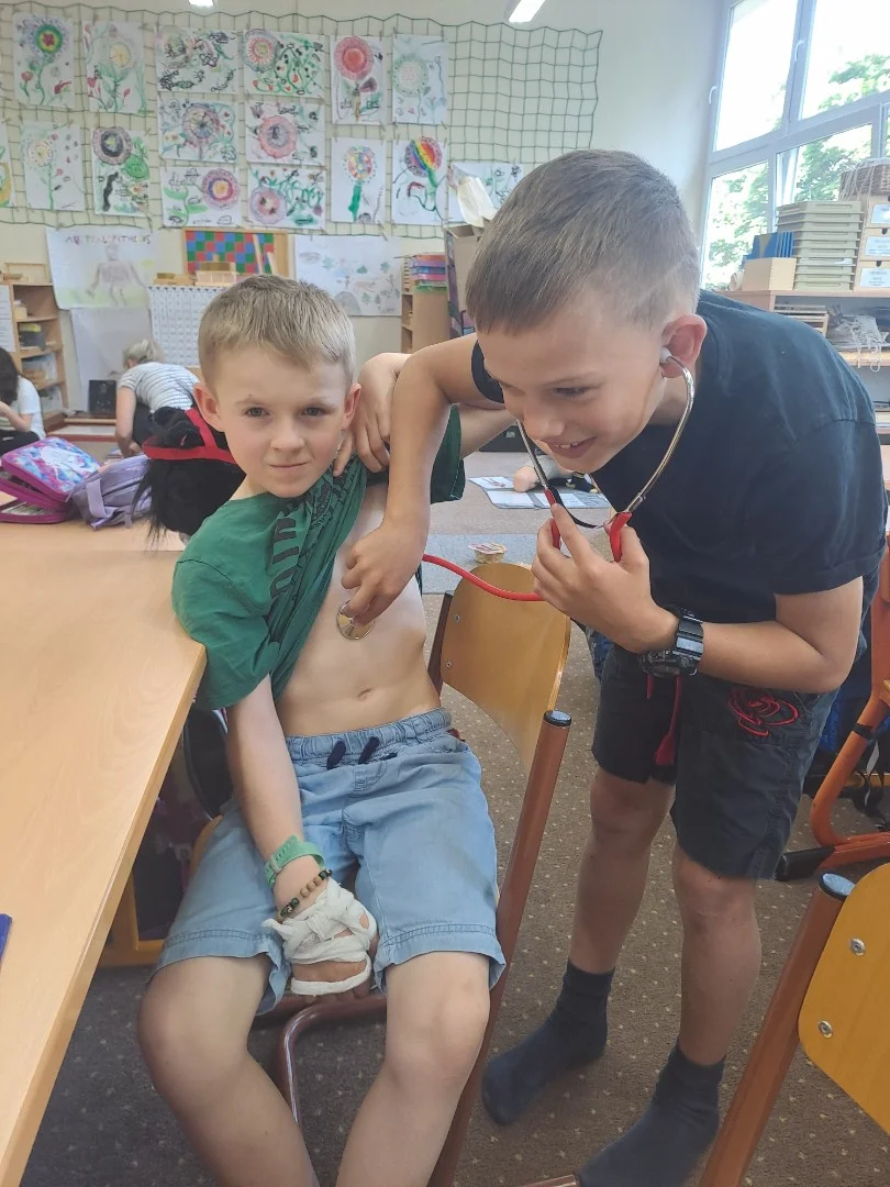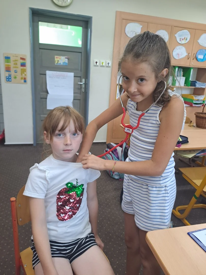 V předposledním týdnu se naše třída proměnila v místo plné malých lékařů a badatelů. Měli jsme projektový týden s tématem Lidské tělo, během kterého se děti poutavou formou seznamovaly se stavbou těla, názvy kostí, svalů i vnitřních orgánů. Pracovaly s pomůckami, vyplňovaly pracovní listy a vše si mohly samy vyzkoušet. Jendou z aktivit byla i vstupní lékařská prohlídka, kdy děti např. měřily krevní tlak tonometrem, poslouchaly srdce a dech fonendoskopem, měřily tělesnou teplotu, kontrolovaly zrak a vše zaznamenávaly do zdravotní karty. Na závěr si každý vytvořil svůj vlastní zdravotnický deník. Týden byl plný nadšení, objevování a praktických zkušeností – všichni se aktivně a s chutí zapojili.