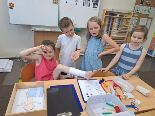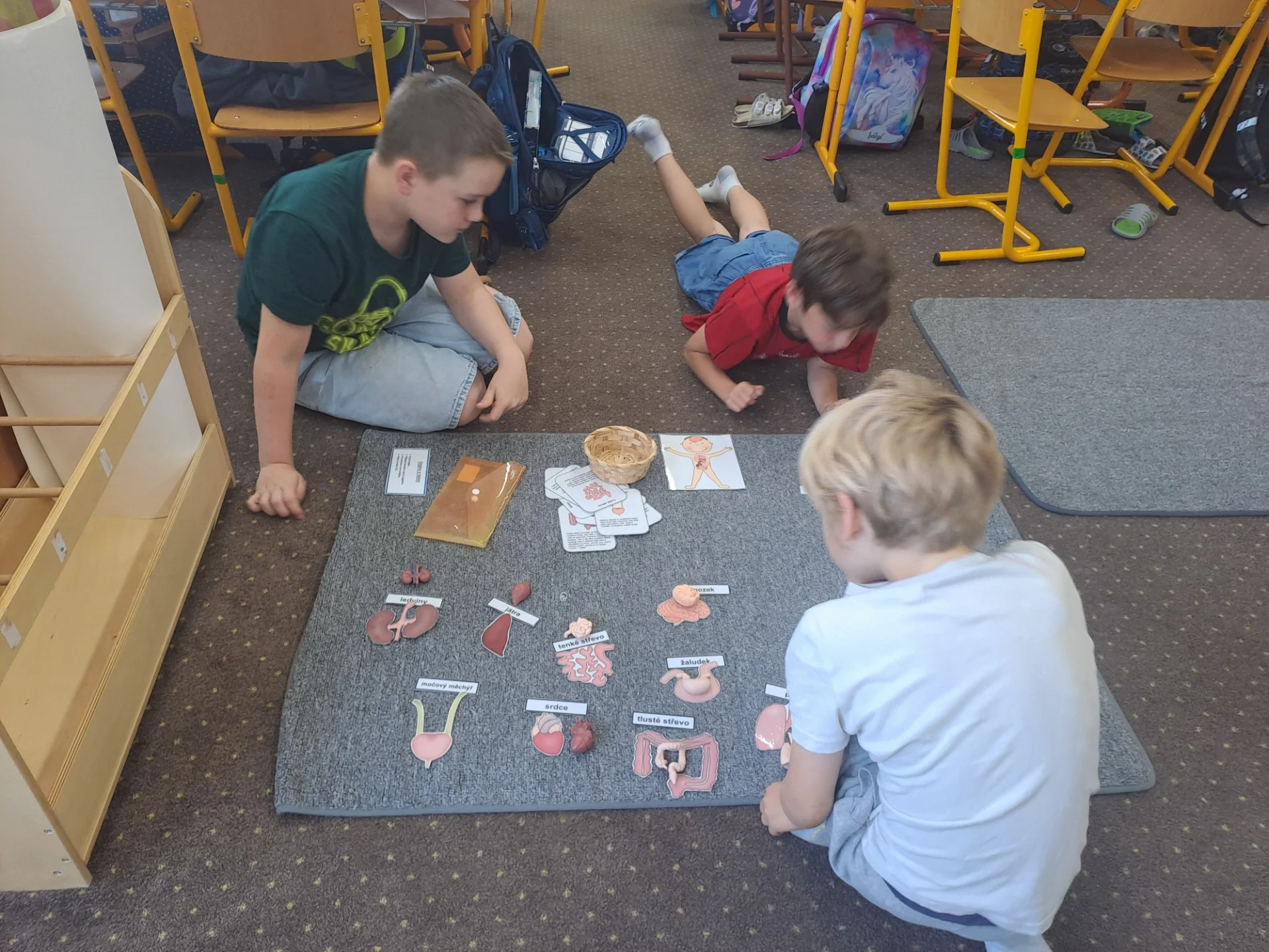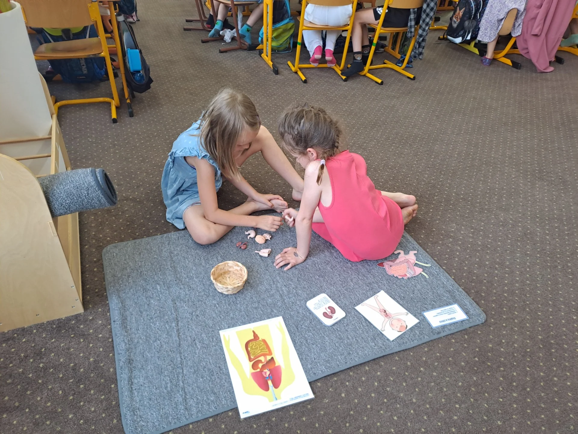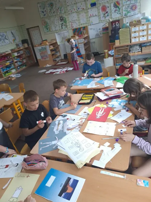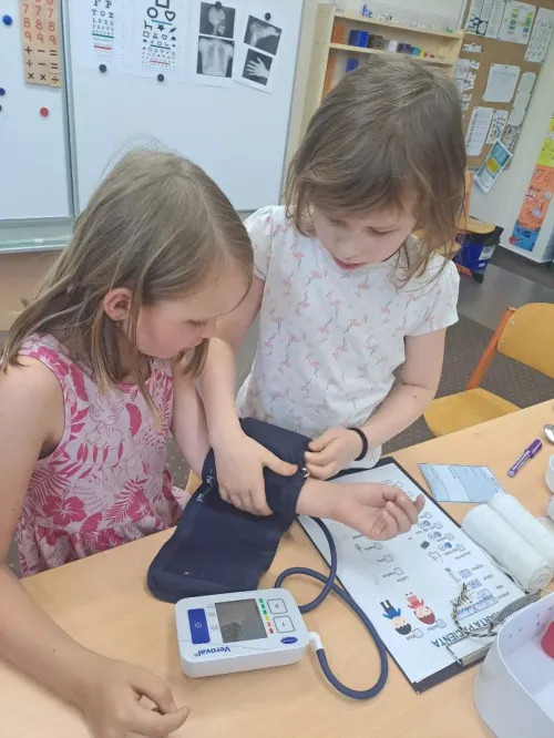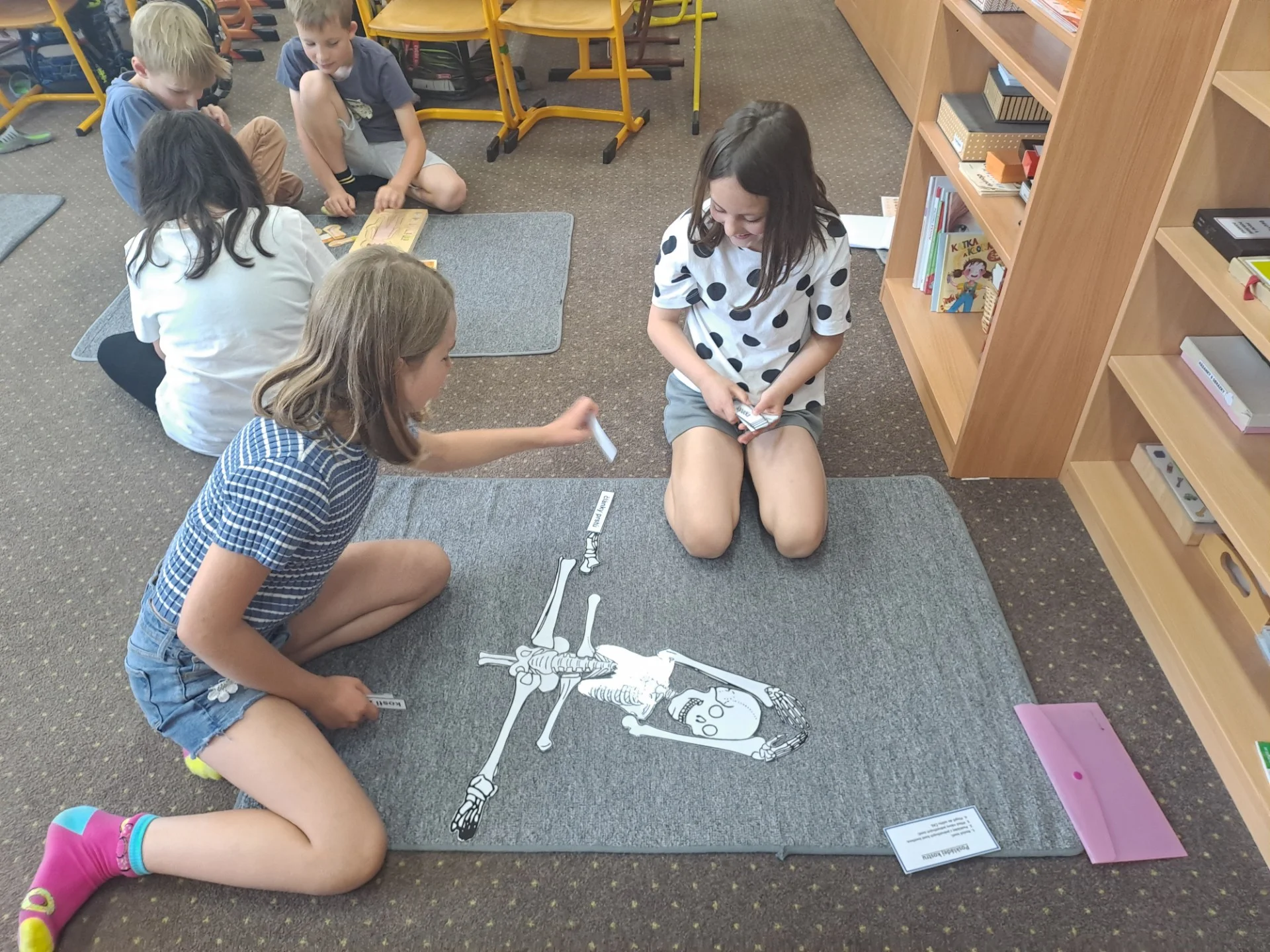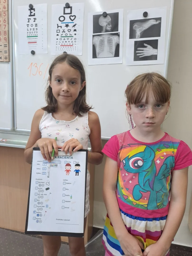 V předposledním týdnu se naše třída proměnila v místo plné malých lékařů a badatelů. Měli jsme projektový týden s tématem Lidské tělo, během kterého se děti poutavou formou seznamovaly se stavbou těla, názvy kostí, svalů i vnitřních orgánů. Pracovaly s pomůckami, vyplňovaly pracovní listy a vše si mohly samy vyzkoušet. Jendou z aktivit byla i vstupní lékařská prohlídka, kdy děti např. měřily krevní tlak tonometrem, poslouchaly srdce a dech fonendoskopem, měřily tělesnou teplotu, kontrolovaly zrak a vše zaznamenávaly do zdravotní karty. Na závěr si každý vytvořil svůj vlastní zdravotnický deník. Týden byl plný nadšení, objevování a praktických zkušeností – všichni se aktivně a s chutí zapojili.
