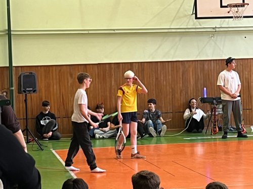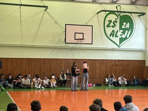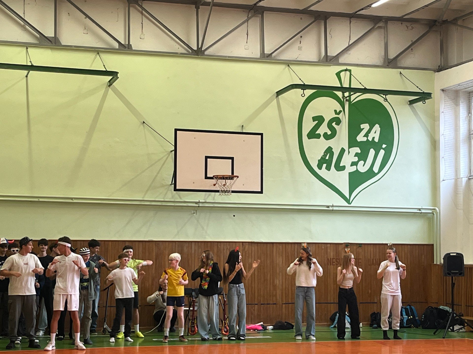 Dnes ráno jsme se s 9. B společně sešli na našem posledním ranním setkávání. Moderátorky nás provedly vzpomínkou na všechna naše společná setkání od 6. třídy. Začali jsme připomenutím ptačího tance ze 6. třídy, pokračovali předvedením talentů našich spolužáků – projeli jsme se na koloběžce, zahráli si tenis a podívali jsme se na techniku našich hasičů. V 8. třídě jsme si připomněli mikulášskou nadílku a vánoční kvíz, kterého se aktivně účastnilo celé publikum. Na závěr devátého ročníku jsme se rozloučili tancem – společně jsme si zazpívali a zatančili Makarenu, kterou si všichni skvěle užili. Bylo to veselé a plné smíchu, přesně tak, jak jsme si naše poslední ranní setkávání představovali!