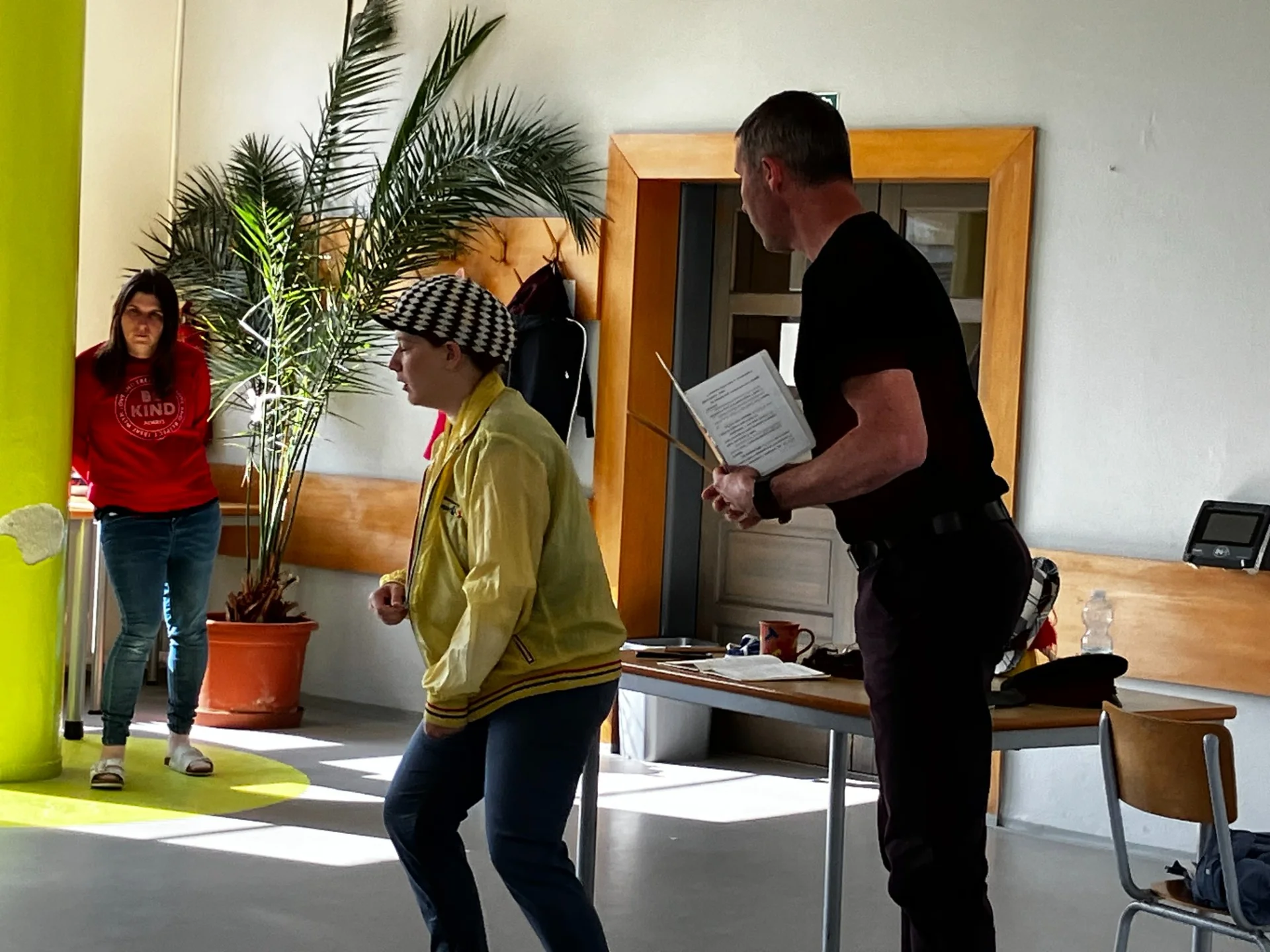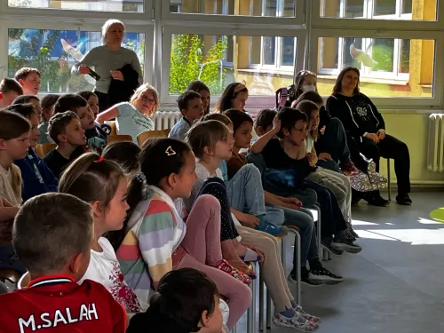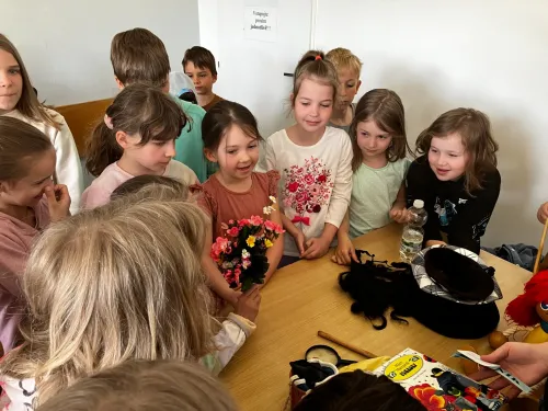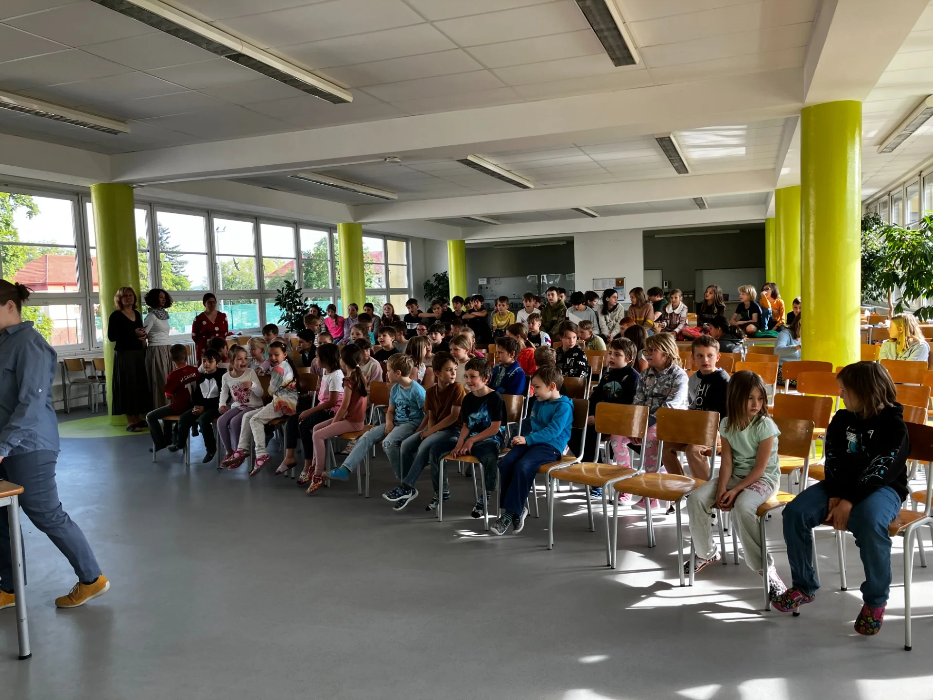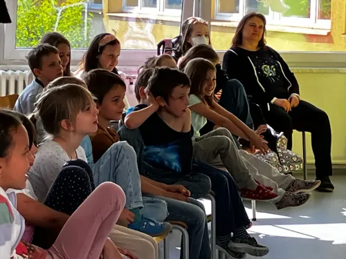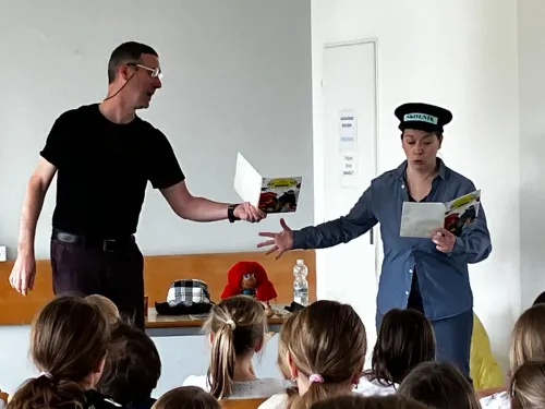 David Vacke a Tereza Hrabalová z agentury Pierot nám do školy přinesli další zajímavé příběhy. Tentokrát zpracování dvou pohádek od Miloše Macourka: Žlutá bunda s pokaženým zipem a Zuzanka a písmenka. Na úvod herci dětem představili formát scénického čtení a vybídli k vlastnímu zpracování jejich oblíbených příběhů. Objasnili jim, že hlavní výhodou scénického čtení je to, že si herci nemusí plně pamatovat text, protože mají textovou oporu v rukou. Naopak nástrahou může být důraz na kvalitní výslovnost a práci s hlasem.