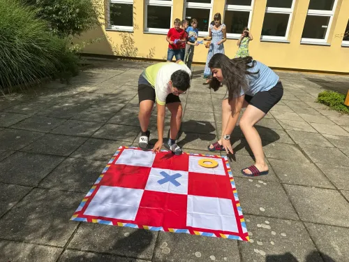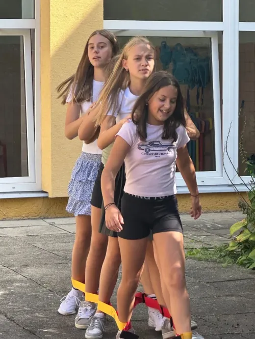 Během dopoledne jsme si vyzkoušeli i další hry, které byly zaměřené na spolupráci. Chodili jsme společně na „lyžích“, kde jsme byli spojeni prostřednictvím speciální pomůcky a museli jsme se dokonale sladit, aby se nám podařilo postupovat vpřed. Zkusili jsme také projít barevným chodníkem, ve kterém bylo potřeba táhnout za jeden provaz a navzájem si pomáhat. Velkou zábavou byly i obří piškvorky, které vyžadovaly strategii a pohotovost.